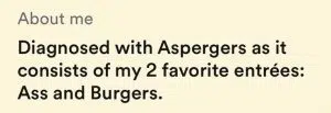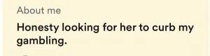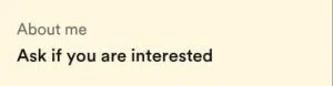 The whole point of this section is so I don’t have to talk to you if I don’t want too. I’m pretty sure this whole app is about quick decisions and judgements and this just tells me you were too lazy to fill it out, but at least you spelled everything right!